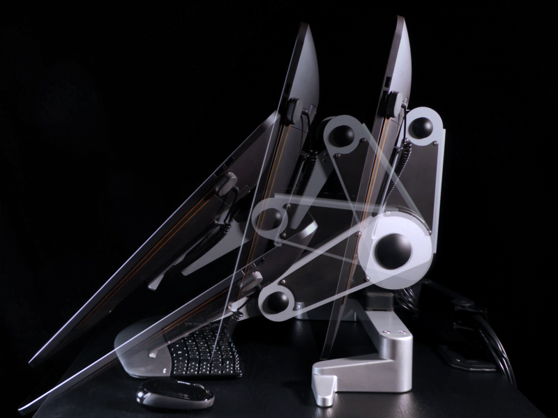 Traditional monitor arms have a small clamp area at the back of the desk.  This is good for freeing up desk space but it can be bad for screen stability.  The drawing below shows a lever and fulcrum below the monitor arms.  This demonstrates that a small force down on screen creates a large bending force at the back of the desk.